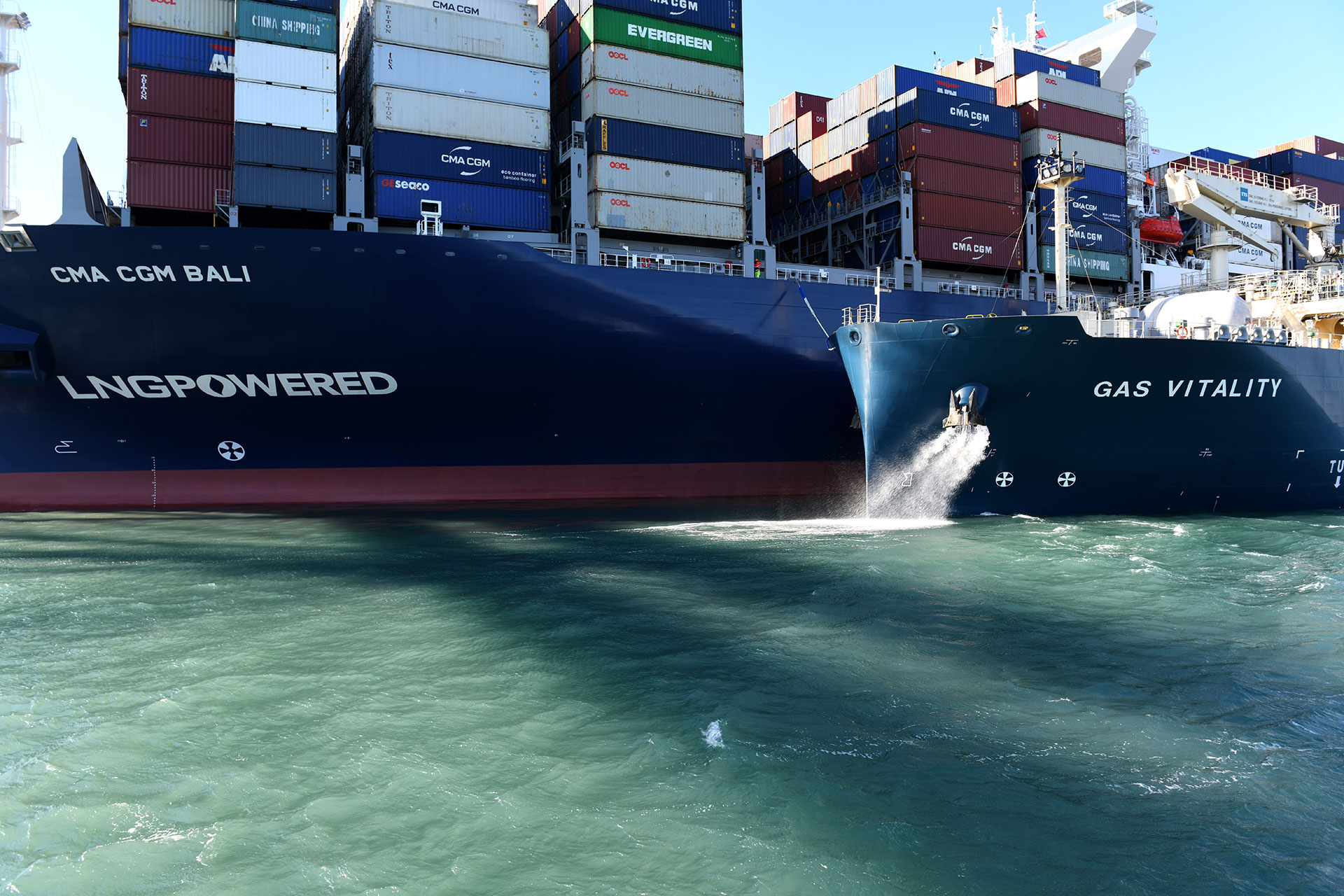 CMA CGM et TotalEnergies réalisent la première opération de soutage de gaz naturel liquéfié d’un navire vers un porte-conteneurs dans le Port de Marseille Fos